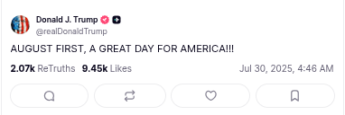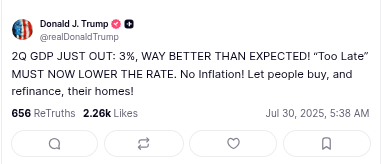 And before you ask — no, I don’t doubt the data. This second quarter estimate was expected to come in higher than the first; the “better than expected” part means projected growth is 3.0% instead of 2.5%. It’s also worth noting that in April, during the original “liberation day,” most of the tariffs were paused — which likely contributed to the bump. A new “liberation day” is now set for Friday.