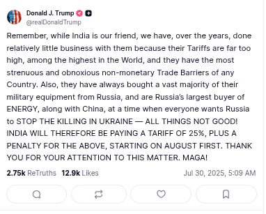 President Bully is at it again — this time trying to muscle India by announcing a 25% tariff plus a mystery penalty “for the above,” whatever that’s supposed to mean. Apparently, we’re slapping new costs on American consumers because India buys oil from Russia and sells us too little stuff. Makes sense if your brain runs on grievance fumes and zero economic literacy. Stay tuned for the inevitable backpedal — August 1st is just around the corner, and President TACO (Trump Always Chickens Out) loves a last-minute retreat.