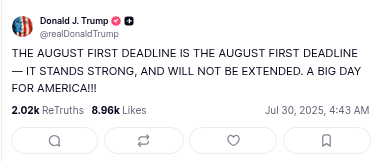 President TACO (Trump Always Chickens Out) announced this morning that he wasn’t going to TACO on the August 1st deadline for the “new” tariffs to take effect. Just a reminder: back in April, he also insisted there would be no pause on the Liberation Day Tariffs. Spoiler — there was. So, stay tuned… because if history’s any guide, we’re just one tantrum away from another flip-flop.