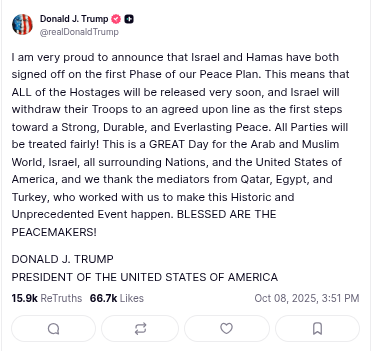• US President Donald Trump said the hostages are likely to be released on Monday. Trump’s announcement did not address some sticking points in the proposal, including Hamas disarmament and governance of Gaza.