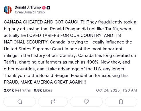 And because those exact Reagan words hurt the Grand-Tariff-Toddler-in-Chief’s feelings, Canada clipped them into a little reminder package and aired it for American voters to enjoy. This is the “fraudulent” ad he rage-quit trade talks over. Spoiler: the only thing fake here is his memory.