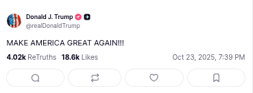 And because nothing says “I definitely didn’t just delete something embarrassing” like yelling the slogan into the void, he tossed this onto the feed in between meltdown drafts: