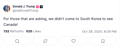Because nothing says “global leadership” like subtweeting Canada during a summit in South Korea.