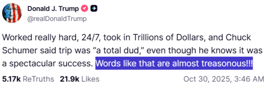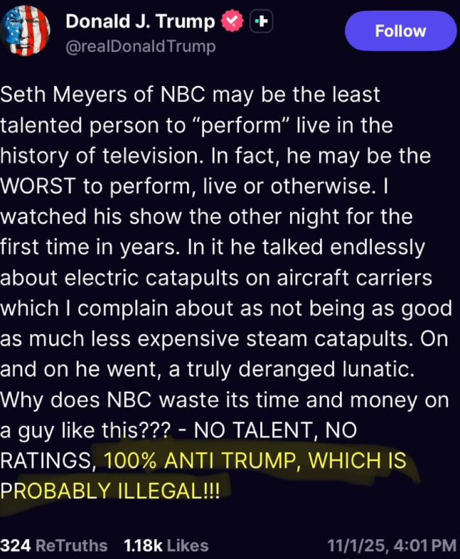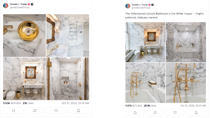 That one where Baghdad Bimbo couldn’t care less about tens of millions of children and seniors losing access to food through SNAP, but is “horrified” about toilets as a way of announcing to the country they continue to destroy our White House …