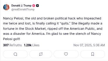 Naturally, he celebrated the news of Rep. Pelosi’s retirement with the subtlety of a foghorn in a library. And, in true form, he accused her of the very things he himself has been investigated for — because projection is still his favorite sport.