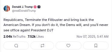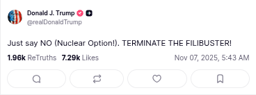 Then this morning, he posted the opposite — telling Republicans to say no to the nuclear option — while still telling them to “terminate the filibuster.” For anyone trying to follow the logic, those are the same thing. He wants the rule gone; he just can’t keep the terminology straight.
