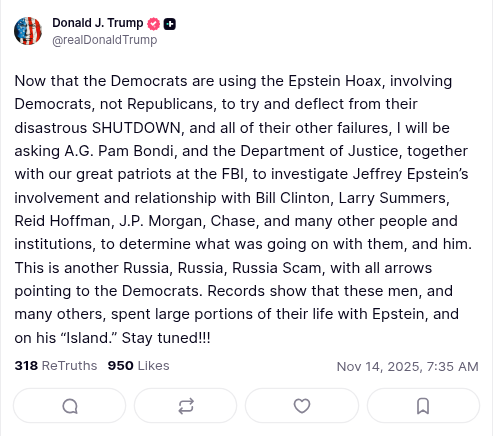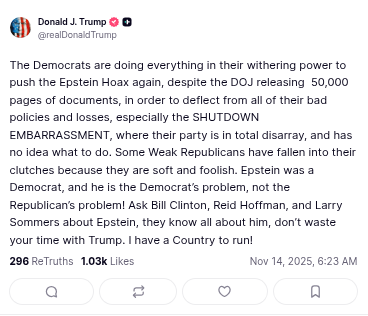 This morning the ego-driven asshole cranked out two fresh “Lies Social” posts, once again screeching that the fight over the Epstein files is a “Democrat hoax,” as if repetition magically turns nonsense into truth.