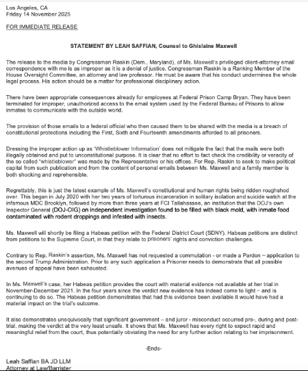 Whistleblower Shares Evidence That Federal Prison Camp Warden is Pampering Ghislaine Maxwell, Maxwell Also Filing a “Commutation Application” With Trump Administration. 11/10/2025.