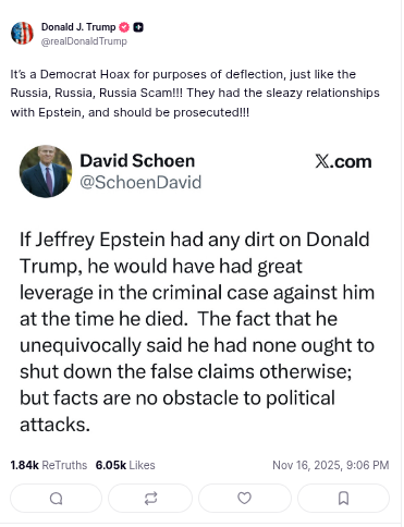 This one went in Friday’s article, but I’m dropping it here for continuity since it’s the warm-up rant where he trotted out his usual “Democrats and Epstein” monologue before the real weekend meltdown even got going.