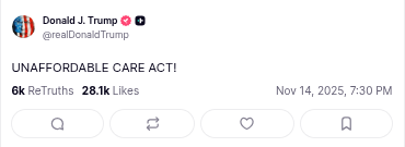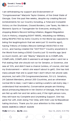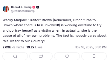 — Rep. Marjorie Taylor Greene🇺🇸 (@RepMTG) November 15, 2025