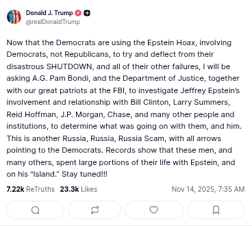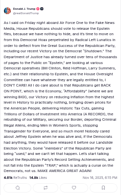 As I said on Friday night aboard Air Force One to the Fake News Media, House Republicans should vote to release the Epstein files, because we have nothing to hide, and it’s time to move on from this Democrat Hoax perpetrated by Radical Left Lunatics in order to deflect from the Great Success of the Republican Party, including our recent Victory on the Democrat “Shutdown.”