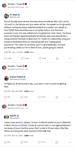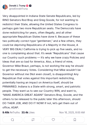 By 11 AM he’d moved on to scolding Indiana Republicans, accusing them of sabotaging redistricting, whining about “politically correct gentlemen,” and demanding they be primaried if they don’t hand the GOP two more seats immediately, like he’s ordering takeout and it’s late.