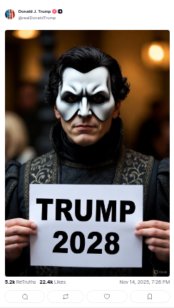 He followed the breakup by posting a Phantom-of-the-Opera knockoff holding a “TRUMP 2028” sign, which is an odd choice considering the Phantom dies alone after terrorizing everyone around him.
