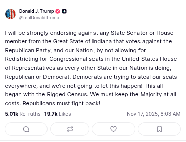 And first thing this morning he was right back at it, threatening to endorse primary challengers against any Indiana Republican who won’t redo their redistricting for him, insisting Democrats are “stealing seats” and blaming it all on the “Rigged Census.”