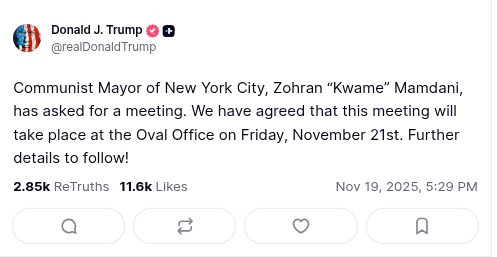 President that Embraced The Crown Prince of Saudi Arabia announced that he’d be meeting with Mayor-Elect Communist Zohran Mamdani.