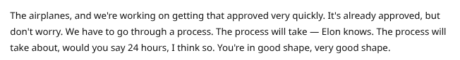 Trump on military sales to Saudi: "We're working on getting that approved very quickly. It's already approved, but don't worry. We have to go through a process. The process will take — Elon knows — the process will take about 24 hours." pic.twitter.com/ym7lSnItL3