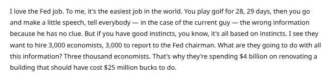 Trump: "I love the Fed job. To me it's the easiest job in the world. You play golf for 28, 29 days, then you go and make a little speech, tell everybody in the case of the current guy the wrong information because he has no clue … it's all based on instincts." pic.twitter.com/ZTiHa6P9A3