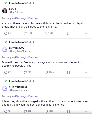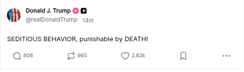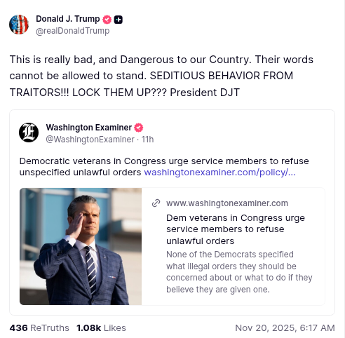 Let it sink in: the guy who pardoned January 6 rioters trying to overthrow the government is now calling for the death of members of Congress for stating a basic fact, that the military is not required to follow unlawful orders and “I was just following orders” is not a legal defense.