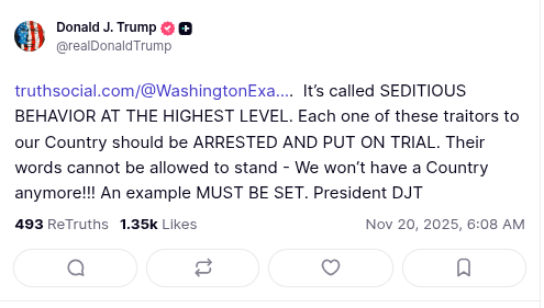 First up, we have the President auditioning for a History Channel documentary nobody asked for, calling for Democratic members of Congress to be arrested and “hung” because they had the audacity to remind military personnel not to follow unlawful orders. Normal Thursday energy. He melts down whenever someone points out that the military isn’t his personal cosplay battalion, and today he went full torch-and-pitchfork about it.