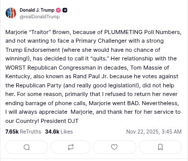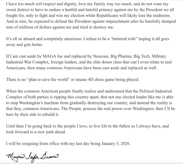Friday, Georgia’s resident chaos engine Marjorie Taylor Greene announced she’ll be leaving Congress in January 2026, as if the institution hadn’t already suffered enough whiplash from her time there.