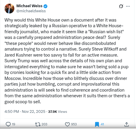 Wednesday AXIOS reported that Special Envoy Russian Fan boy Steve Witkoff crafted a “peace plan” with Russian envoy Kirill Dmitriev.