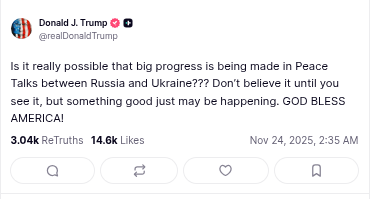 The 28-point plan was blasted as not really a peace plan but more like a complete surrender of Ukraine to Russia. President Moron moronically gave Ukraine until Thursday (Thanksgiving Day in America) to accept the plan.