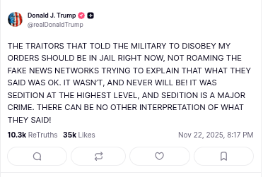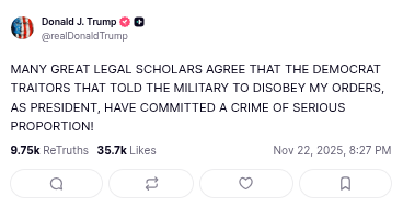 The Department of War has received serious allegations of misconduct against Captain Mark Kelly, USN (Ret.). In accordance with the Uniform Code of Military Justice, 10 U.S.C. § 688, and other applicable regulations, a thorough review of these allegations has been initiated to determine further actions, which may include recall to active duty for court-martial proceedings or administrative measures. This matter will be handled in compliance with military law, ensuring due process and impartiality. Further official comments will be limited, to preserve the integrity of the proceedings. The Department of War reminds all individuals that military retirees remain subject to the UCMJ for applicable offenses, and federal laws such as 18 U.S.C. § 2387 prohibit actions intended to interfere with the loyalty, morale, or good order and discipline of the armed forces. Any violations will be addressed through appropriate legal channels. All servicemembers are reminded that they have a legal obligation under the UCMJ to obey lawful orders and that orders are presumed to be lawful. A servicemember’s personal philosophy does not justify or excuse the disobedience of an otherwise lawful order.