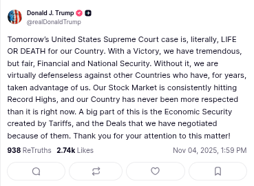 Tomorrow’s United States Supreme Court case is, literally, LIFE OR DEATH for our Country. With a Victory, we have tremendous, but fair, Financial and National Security. Without it, we are virtually defenseless against other Countries who have, for years, taken advantage of us. Our Stock Market is consistently hitting Record Highs, and our Country has never been more respected than it is right now. A big part of this is the Economic Security created by Tariffs, and the Deals that we have negotiated because of them. Thank you for your attention to this matter!