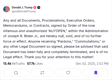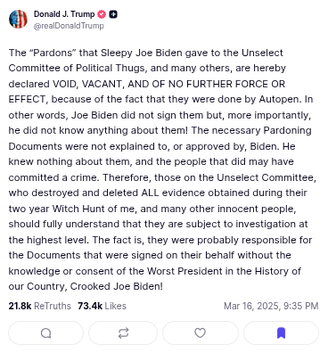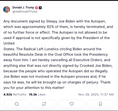 This morning President Who Thinks his social media posts are laws announced that everything Biden signed with the autopen was null and void (again).