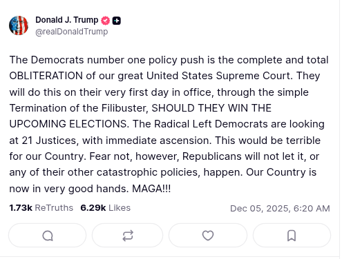 Democrats want 21 supreme’s on the court, and if they win control next year they will force the President to sign that into law, when the bust the filibuster in the Senate to pass it.