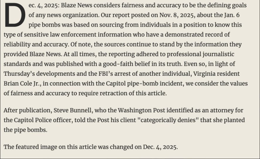 The Blaze has finally retracted its story accusing a former Capitol Police officer of being the Jan 6th pipe bomber, after a different person was arrested today. pic.twitter.com/ATL4bEQny5