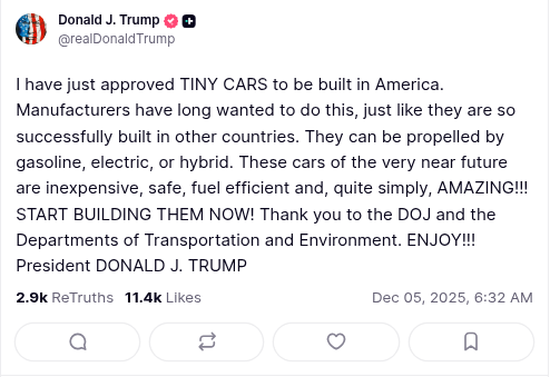 After his reality star aka the Secretary of Transportation told fans they’d be able to buy 1970’s style station wagons again, President Legend in his own mind announced his approval to build “TINY CARS”…