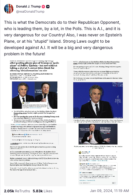 In a Truth Social post in January 2024, Trump said he’d “never” been on Epstein’s plane. An email released by DOJ as part of the Epstein Files shows an assistant U.S. attorney saying Trump flew on the plane “many more times than previously has been reported.” Which is it? pic.twitter.com/Zf1JqbCpf5