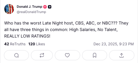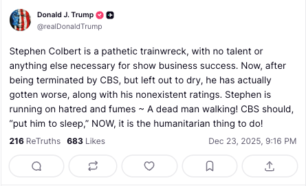 President Who Needs Visited by the Ghosts of Christmas Past, Present, and Future took to “Lie’s Social” after midnight on Christmas Eve, apparently skipping redemption and going straight to the rant. He resurfaced an old monologue from Stephen Colbert, demanded his audience weigh in on the “worst” late-night TV host currently breathing, and once again floated the promise to violate the Constitution even more enthusiastically in the days to come.
