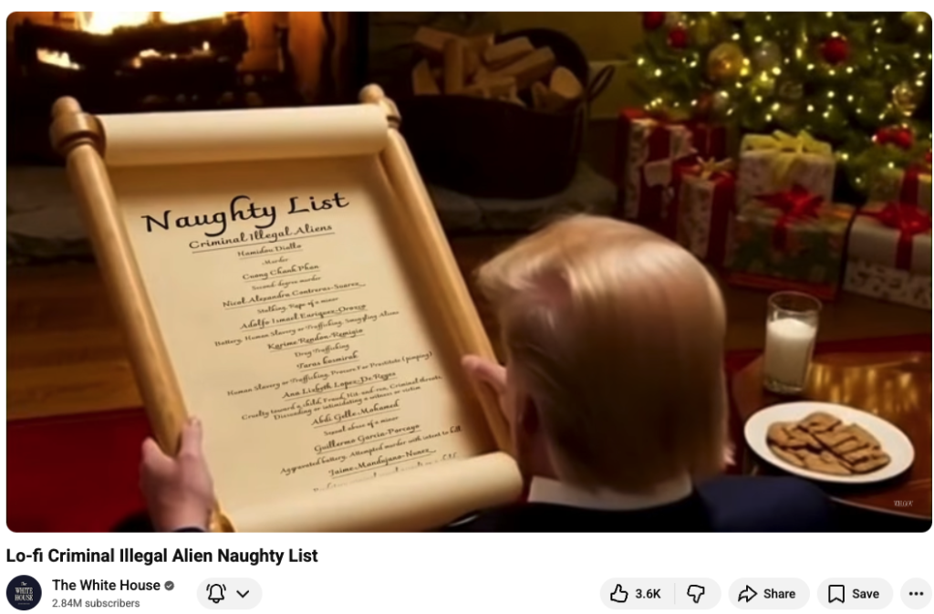 Because cruelty apparently needed a holiday theme, the White House spent Christmas week escalating its attacks on undocumented workers. The administration’s official YouTube channel followed suit, livestreaming an AI-generated “naughty list” video that casts the president as Santa instead of the Grinch.