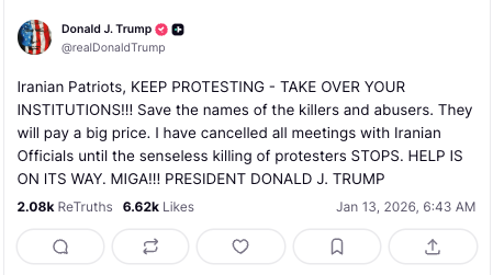 I support protest. I support it in Tehran and I support it in Minneapolis. What I don’t support is a president who cheers rebellion abroad while promising “retribution” at home. In one breath he tells Iranians to take over their institutions, and in the next he tells Minnesotans not to worry because punishment is coming. Dissent is freedom when it’s useful to him and criminal when it isn’t. That isn’t leadership. That’s authoritarian mood-swing diplomacy.