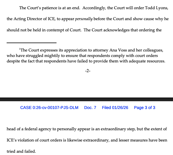 This morning a Judge ordered Todd Lyons the acting head of ICE to appear in court on Friday to explain the agency’s repeated violated of court orders.