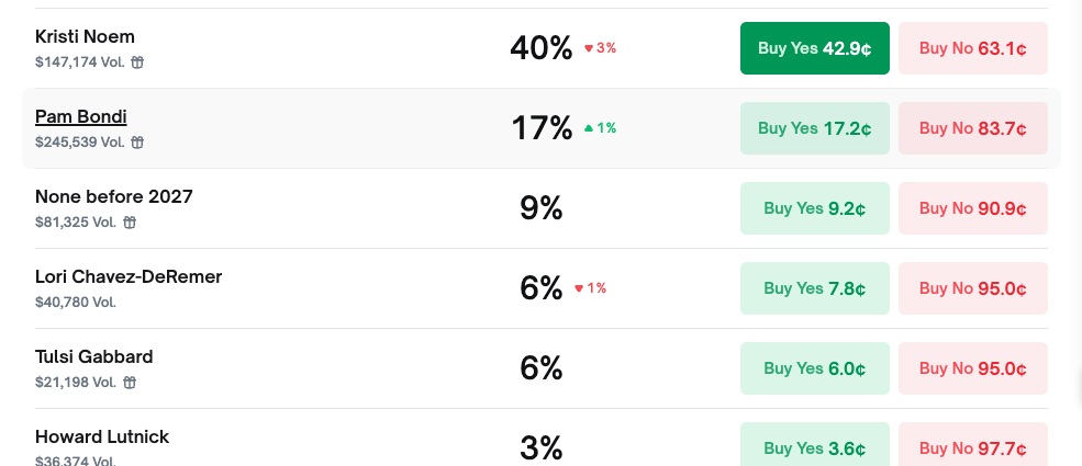 Having been tipped at only 12 percent probability on January 21, Noem had soared to 40 percent on Kalshi and 43 percent on Polymarket as of Monday afternoon.