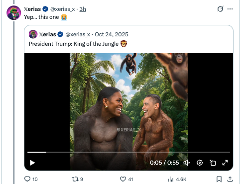 President Trump posted a video featuring the Obamas as monkeys on Truth Social.