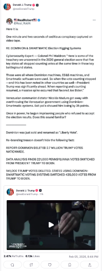 In a late night posting spree the Racist shared a dumb 1 minute video that pushed a conspiracy theory that 4G chips were embedded in voting machines–twice!