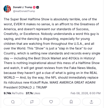 The Super Bowl Halftime Show is absolutely terrible, one of the worst, EVER! It makes no sense, is an affront to the Greatness of America, and doesn’t represent our standards of Success, Creativity, or Excellence. Nobody understands a word this guy is saying, and the dancing is disgusting, especially for young children that are watching from throughout the U.S.A., and all over the World. This “Show” is just a “slap in the face” to our Country, which is setting new standards and records every single day — including the Best Stock Market and 401(k)s in History! There is nothing inspirational about this mess of a Halftime Show and watch, it will get great reviews from the Fake News Media, because they haven’t got a clue of what is going on in the REAL WORLD — And, by the way, the NFL should immediately replace its ridiculous new Kickoff Rule. MAKE AMERICA GREAT AGAIN! President DONALD J. TRUMP