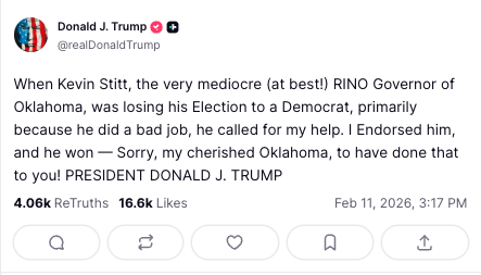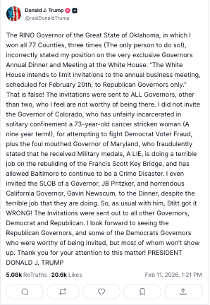 “I am writing to inform you that President Donald J. Trump is inviting all governors of the 55 States and territories to the Friday, Feb. 20 NGA Business Breakfast at 8:30am est.,” Stitt wrote. “He was very clear in his communications with me that this is a National Governors Association’s event, and he looks forward to hosting you and hearing from governors across the country. President Donald Trump said this was always his intention, and we have addressed the misunderstanding in scheduling.”