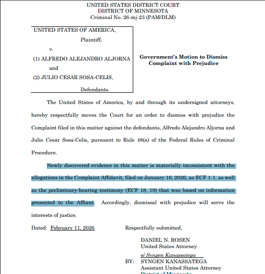 BREAKING: DOJ moves to drop criminal charges in alleged shovel/broom attack in Minneapolis that led ICE to open fire. "Newly discovered evidence in this matter is materially inconsistent with the allegations in the Complaint Affidavit," prosecutors say. Move to dismiss v. 2… https://t.co/kuR1WsamV5