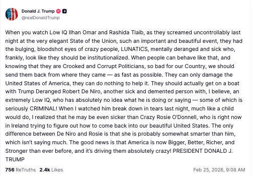 When you watch Low IQ Ilhan Omar and Rashida Tlaib, as they screamed uncontrollably last night at the very elegant State of the Union, such an important and beautiful event, they had the bulging, bloodshot eyes of crazy people, LUNATICS, mentally deranged and sick who, frankly, look like they should be institutionalized. When people can behave like that, and knowing that they are Crooked and Corrupt Politicians, so bad for our Country, we should send them back from where they came — as fast as possible. They can only damage the United States of America, they can do nothing to help it. They should actually get on a boat with Trump Deranged Robert De Niro, another sick and demented person with, I believe, an extremely Low IQ, who has absolutely no idea what he is doing or saying — some of which is seriously CRIMINAL! When I watched him break down in tears last night, much like a child would do, I realized that he may be even sicker than Crazy Rosie O’Donnell, who is right now in Ireland trying to figure out how to come back into our beautiful United States. The only difference between De Niro and Rosie is that she is probably somewhat smarter than him, which isn’t saying much. The good news is that America is now Bigger, Better, Richer, and Stronger than ever before, and it’s driving them absolutely crazy! PRESIDENT DONALD J. TRUMP