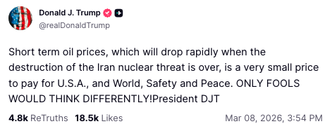 If you’re a Republican, the politics of this conflict have to worry you. With the Strait of Hormuz closed, oil prices have soared to more than $100 per barrel (from just under $70 per barrel 10 days ago.) There’s been a huge spike in gas prices nationally. The Wall Street Journal called it “the most severe energy crisis since the 1970s and threatening to derail the global economy.” The G7 nations — led by France — are eyeing the release of as many as 400 million barrels from their strategic reserves in order to calm the situation. Asian and European markets were getting rocked early Monday.