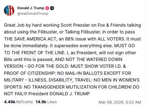 Never one to keep his threats to a reasonable number per day, Empty Threat hopped on Lies Social again to tell Congress he won’t sign any bills unless they pass the SAVE Act first. And because one demand apparently isn’t enough, he now wants the voter suppression bill to also eliminate mail-in voting and ban gender-affirming surgeries for minors.