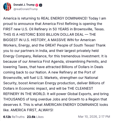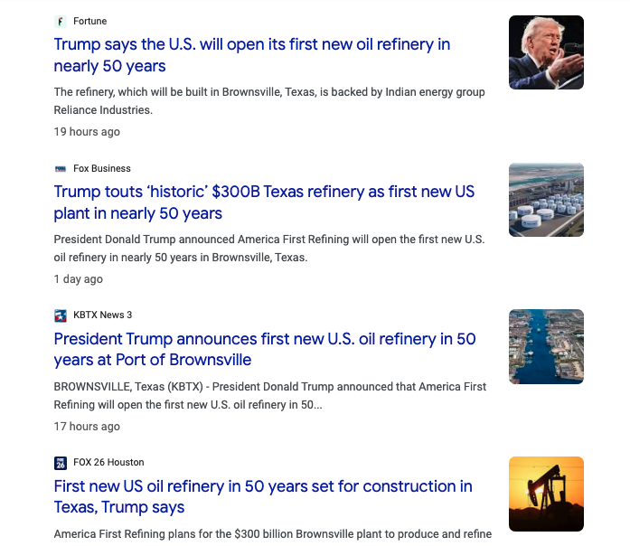 You know, sometimes the story inside the story is actually the better story, and this is one of those cases. So, the first story is, you know, you have Donald Trump here announcing a new refinery in Brownsville, Texas, and taking all the credit for it. It’s because of his America First agenda.