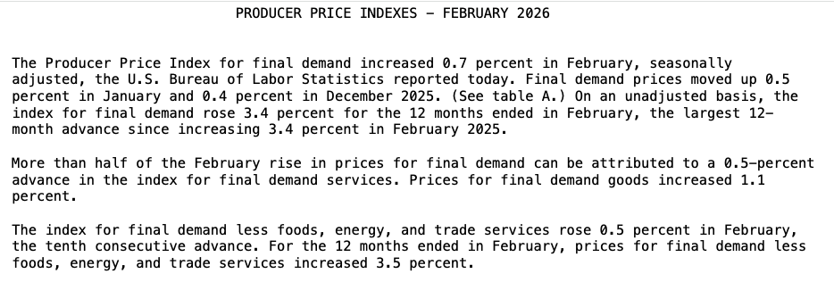 www.cnbc.com/2026/03/18/p… PPI increased a seasonally adjusted 0.7% on the month, the BLS reported Wednesday. Excluding volatile food and energy costs, core PPI increased 0.5%. Economists surveyed by Dow Jones had been looking for increases of 0.3% for both measures.