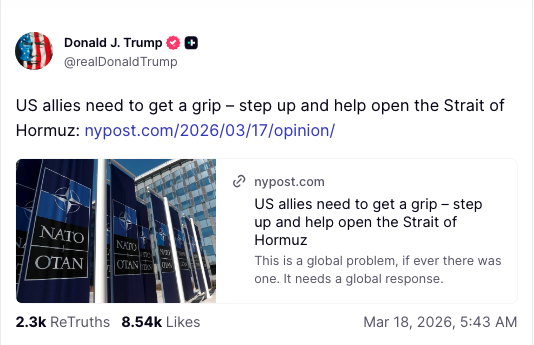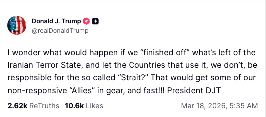 Trump on Strait of Hormuz: We don't need anybody. We're the strongest nation in the world. pic.twitter.com/GelmtWQrB1