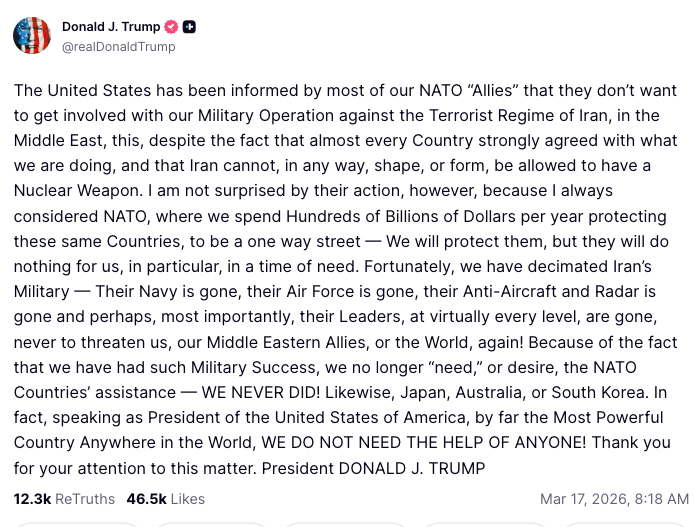 But it’s interesting. I’m almost doing it, in some cases, not because we need them, but because I want to find out how they react. Because I’ve been saying for years that if we ever did need them, they won’t be there. Not all of them, but they won’t be there. I was very surprised with the United Kingdom because the United Kingdom, two weeks ago, I said, why don’t you send some ships over?